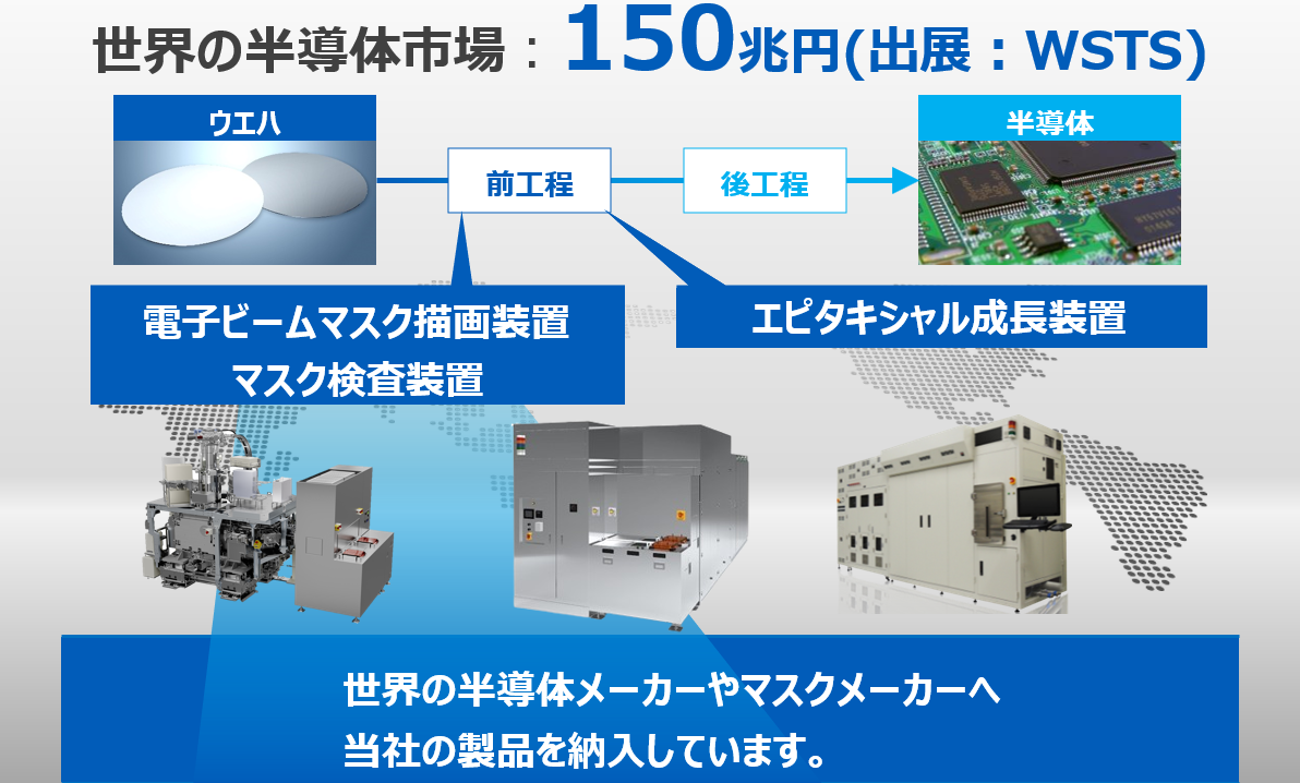 当社は、半導体製造工程におけるフォトマスク製造の工程で使用される電子ビームマスク描画装置及びマスク検査装置を製造しています。また、前工程と呼ばれる製造工程のうち、エピタキシャル成長を行う工程で使用されるエピタキシャル成長装置といった半導体製造装置を通じて世界の半導体市場に貢献しています。
